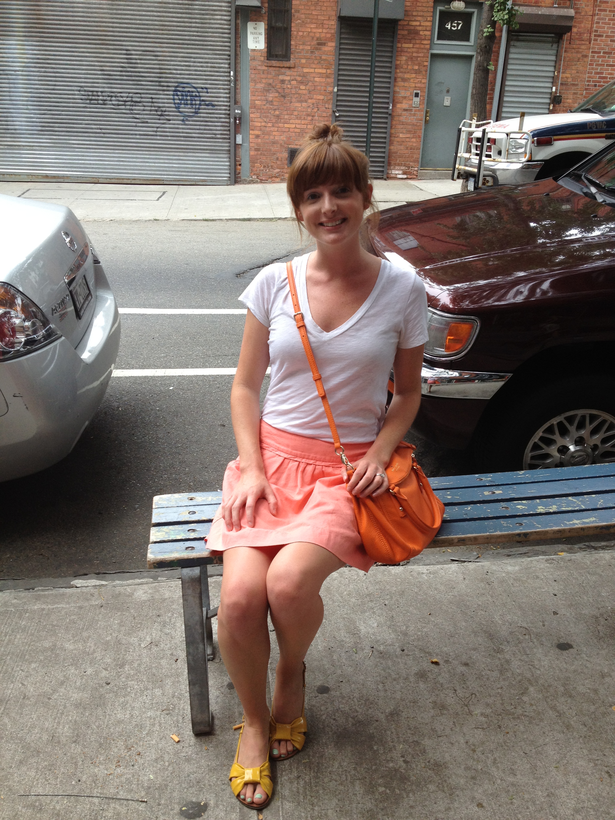 I adored how simple and lovely Jillian looked even in the vile heat and humidity of the day. She took a classic, basic look but added an unexpected twist by pairing a white tee and pink skirt with orange and yellow accessories. Nothing is either ostentatious nor matchy-matchy but it’s also not predictable. Oh, and I don’t know if you can see from here, but her toenails are painted a gorgeous 1950s kitchen appliance mint color. Brava Jillian.